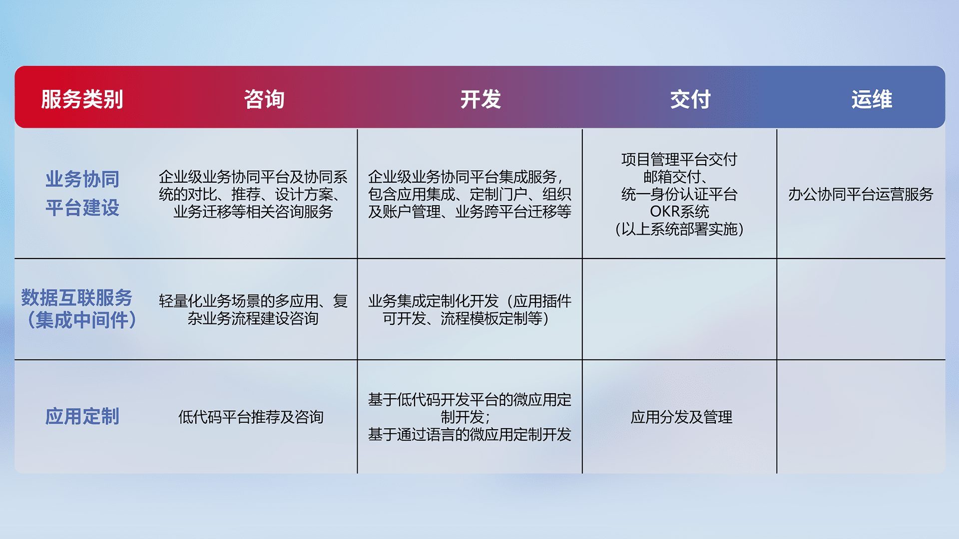 针对钉钉、、、企微、、、、IDaas等平台级产品提供产品的规划、、、、方案、、、、交付、、、定制化开发等服务,,实现如统一协同办公、、、、智能客户服务、、、、混合会议管理、、智能数据查询、、、等业务场景,,,,实现数字化转型。。。。