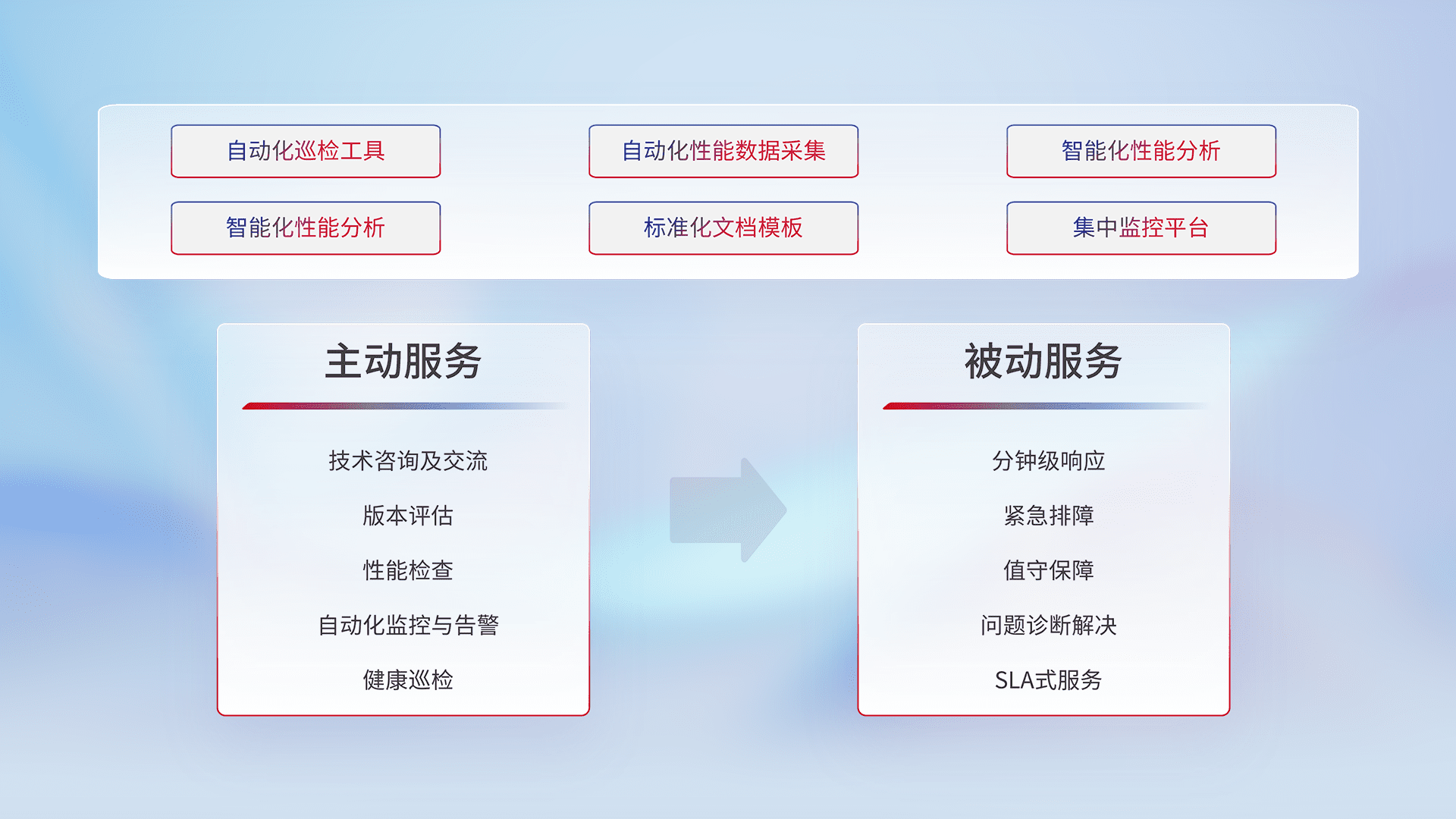 智能化工具和标准化文档,,,,保障服务质量,,提供主动服务(包含技术咨询、、、版本评估、、性能检查、、、自动化监控与告警、、健康巡检)和被动服务包含(分钟级响应、、紧急排障、、值守保障、、、问题诊断解决、、、、SLA服务)。。