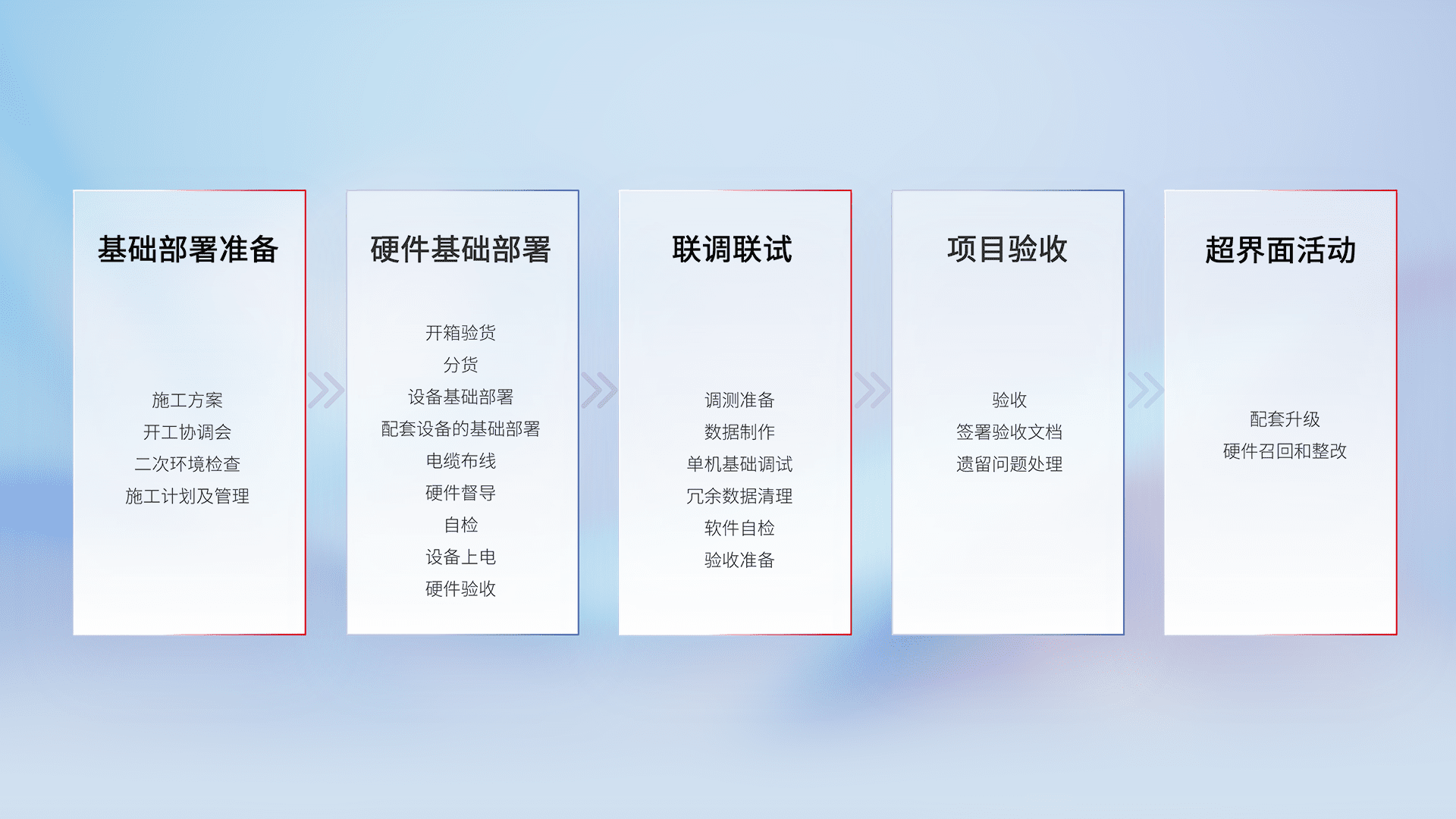 从基础部署准备、、、、硬件基础部署、、、联调联试、、、、项目验收、、越界面活动的全过程可追溯,,,保证施工质量和进度。。